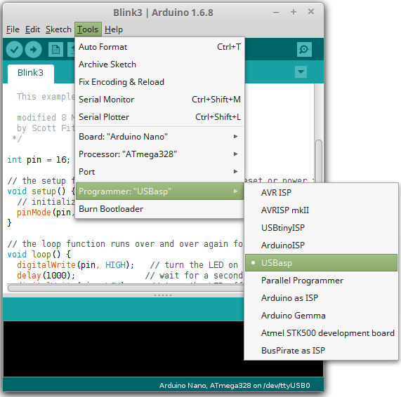 Sometimes one will need to program an Arduino board that does not have a programming interface or will want to build a custom one using and Atmel AVR chip. If the chip contains no bootloader or we do not have a serial interface we can use an external ICSP programmer, such as the USBasp. In this page we will explain how to use such programmer.